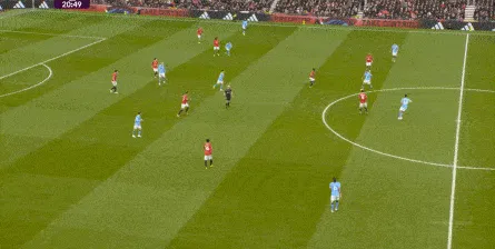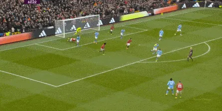 但是,曼城的后场拔升并不明显,所以在这次出球当中,姆贝乌莫的回撤接球依然轻松,阿克和罗德里都跟不上,这让曼联得以分到边路,完成了多尔古和阿玛德-迪亚洛的连线: