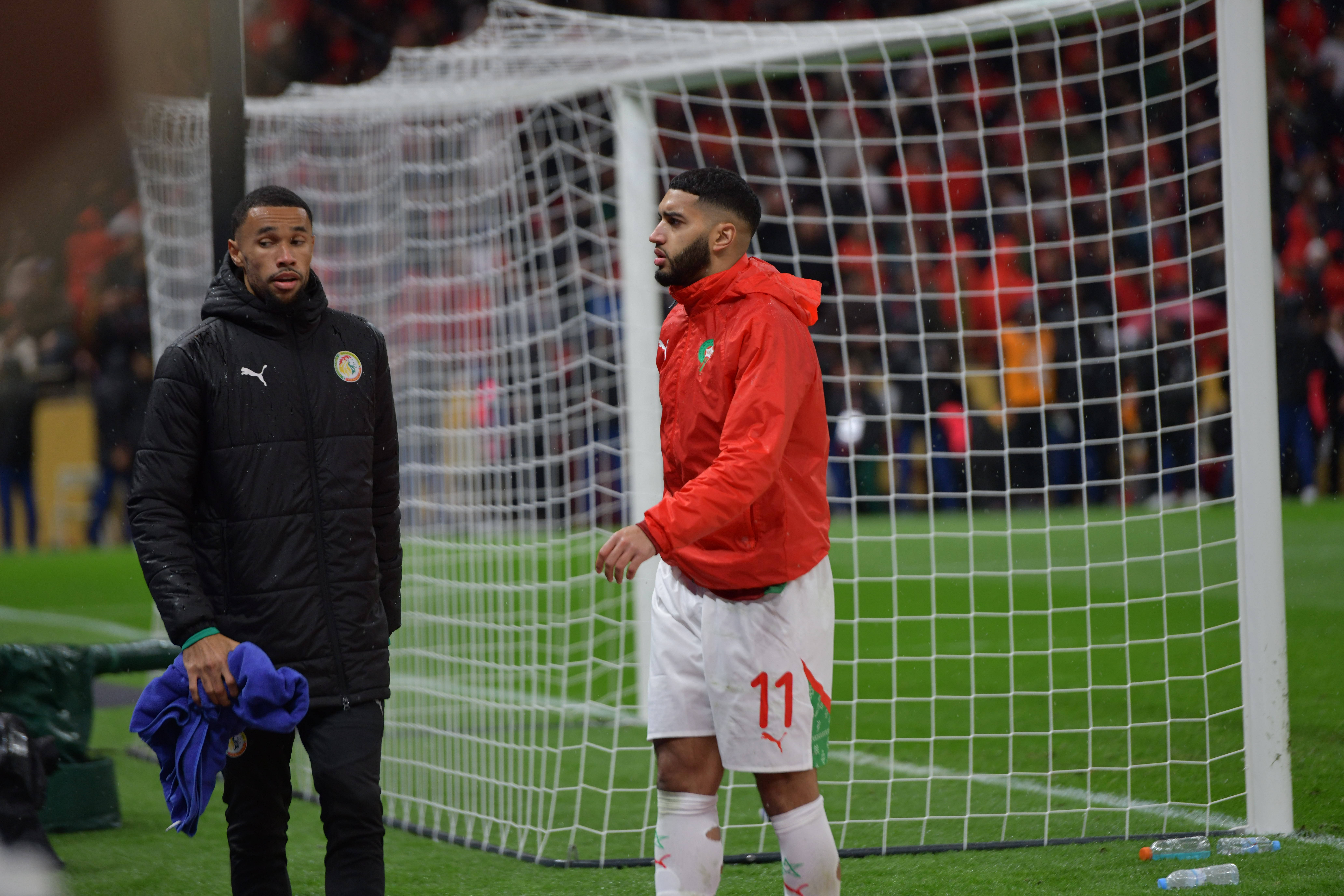 这次风波过后,塞内加尔的底线后就多出了一名黑衣男子,他独自站在球门后,手持门迪的毛巾,并在他需要时递给他。他就是塞内加尔的替补门将迪乌夫。而如图所示,摩洛哥也派出了被替换下场的11号球员赛巴里站在迪乌夫面前,试图阻碍他和门迪之间的毛巾传递。