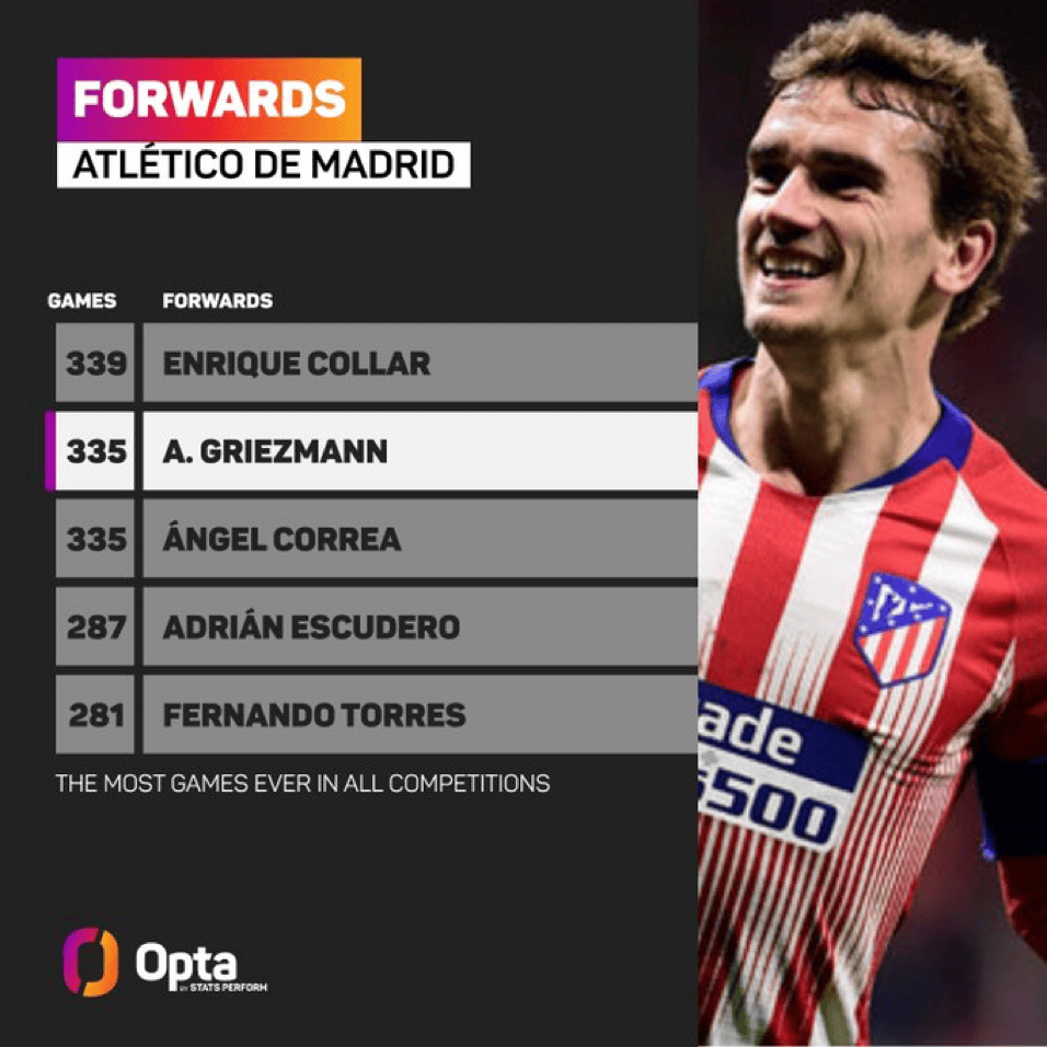JRS直播吧01月19日讯 根据OptaJose的统计,格列兹曼追平了安赫尔-科雷亚,成为马德里竞技队史出场第二多的前锋球员(335次出场),仅次于恩里克-科拉尔(339场)。